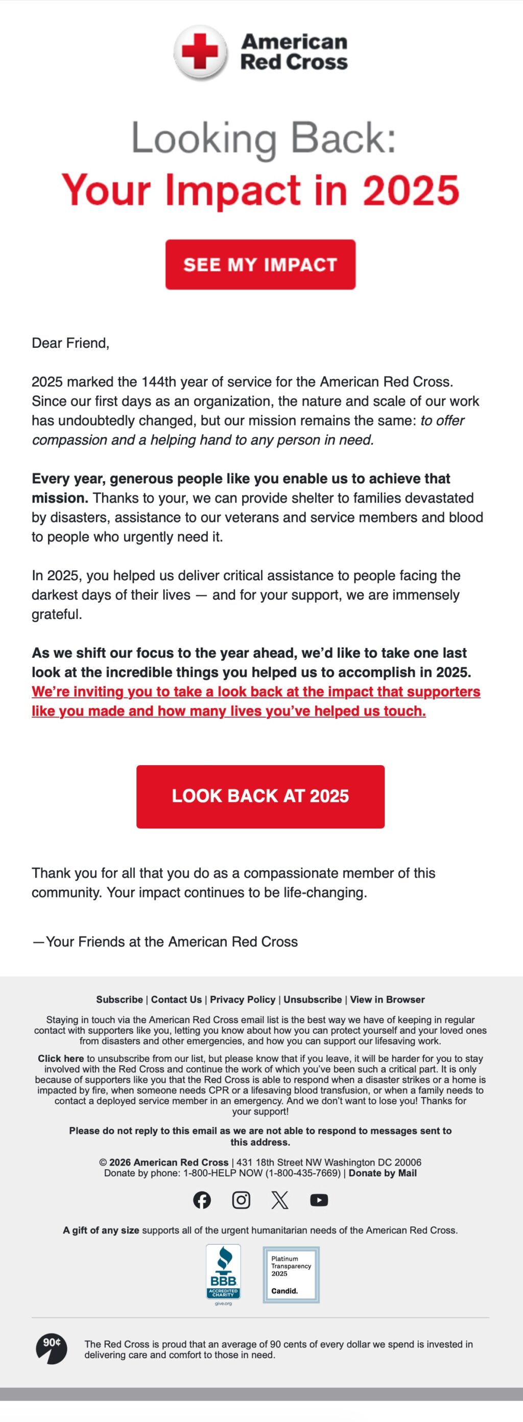 HomeUPDATEAmerican Red Cross: Here’s what you helped us do in 2025➡UPDATE American Red Cross: Here’s what you helped us do in 2025➡ 5 hours ago Shares: Previous PostSave the Children: Quick question – how do you want to help children in 2026? Related Posts UPDATE American Red Cross: Here’s what you helped us do in 2025➡ Donorli5 hours ago ENGAGEMENT Save the Children: Quick question – how do you want to help children in 2026? Donorli6 days ago CULTIVATION charity: water: Good News: You showed up Donorli1 week ago APPEAL CARE: Your gift matched 3 MONTHS IN A ROW Donorli2 weeks ago
