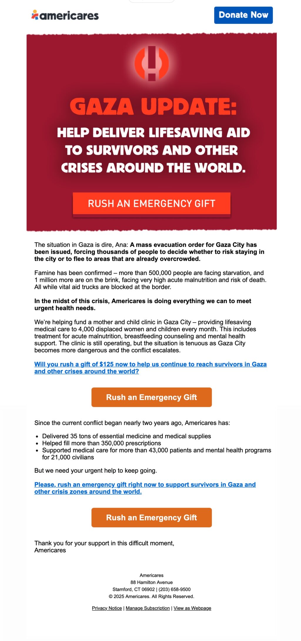 HomeAPPEALAmericares: URGENT: Gaza City is being evacuated – your support is criticalAPPEAL Americares: URGENT: Gaza City is being evacuated – your support is critical 2 months ago Tags:emergency Shares: Previous PostSave the Children: 🪄 The power of booksNext PostUNHCR: Afghan earthquake survivors are receiving help Related Posts APPEAL MAP International: EMERGENCY APPEAL: Your help needed for Hurricane Melissa survivors Donorli7 days ago APPEAL UNHCR: URGENT: Brutal violence in El Fasher forcing thousands to flee Donorli2 weeks ago APPEAL IRC: I want to make sure you receive the latest crisis briefing out of Gaza → Donorli3 weeks ago APPEAL Save the Children: 🌍 Open “a new world” for children in conflict Donorli4 weeks ago