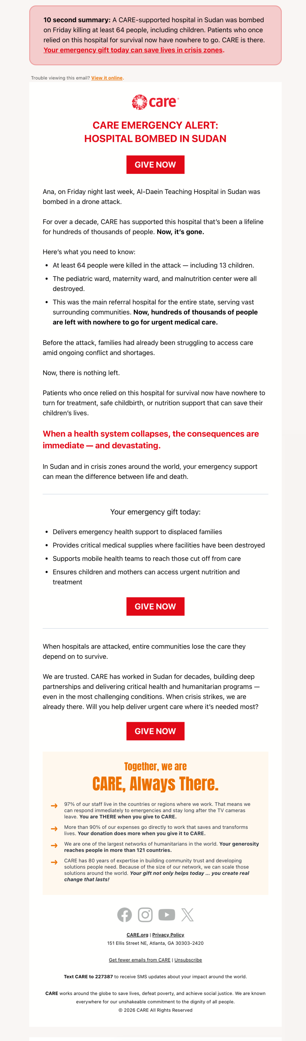 HomeAPPEALCARE Emergency: Hospital bombed in SudanAPPEAL CARE Emergency: Hospital bombed in Sudan 4 hours ago Shares: Previous PostUNHCR: There is no time for tears Related Posts APPEAL CARE Emergency: Hospital bombed in Sudan Donorli4 hours ago APPEAL UNHCR: There is no time for tears Donorli1 week ago NEWSLETTER American Red Cross: We are so very grateful ❤ Donorli2 weeks ago APPEAL International Rescue Committee: I never could have imagine what would happen to my home country Donorli3 weeks ago