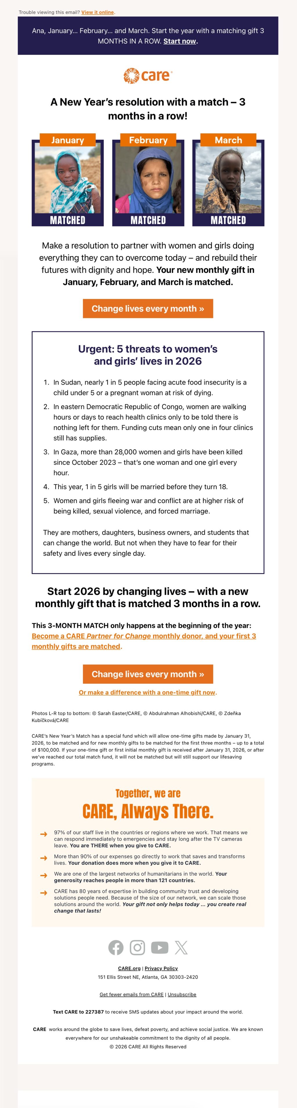 HomeAPPEALCARE: Your gift matched 3 MONTHS IN A ROWAPPEAL CARE: Your gift matched 3 MONTHS IN A ROW 2 weeks ago Tags:girlswomen Shares: Previous PostMonia Hassan, UNHCR: UNHCR’s Global Appeal 2026Next Postcharity: water: Good News: You showed up Related Posts ENGAGEMENT Save the Children: Quick question – how do you want to help children in 2026? Donorli3 days ago CULTIVATION charity: water: Good News: You showed up Donorli1 week ago APPEAL CARE: Your gift matched 3 MONTHS IN A ROW Donorli2 weeks ago APPEAL Monia Hassan, UNHCR: UNHCR’s Global Appeal 2026 Donorli3 weeks ago