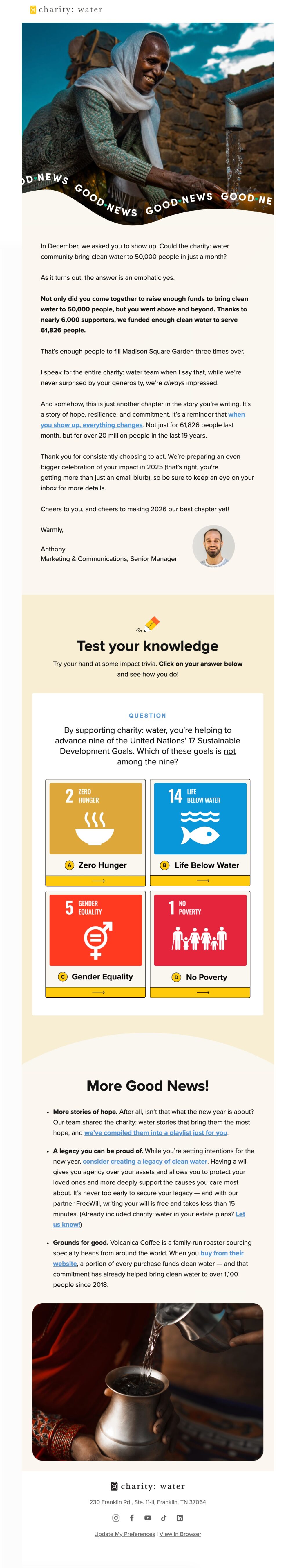 HomeCULTIVATIONcharity: water: Good News: You showed upCULTIVATIONTHANK YOU charity: water: Good News: You showed up 1 week ago Tags:water Shares: Previous PostCARE: Your gift matched 3 MONTHS IN A ROWNext PostSave the Children: Quick question – how do you want to help children in 2026? Related Posts ENGAGEMENT Save the Children: Quick question – how do you want to help children in 2026? Donorli3 days ago CULTIVATION charity: water: Good News: You showed up Donorli1 week ago APPEAL CARE: Your gift matched 3 MONTHS IN A ROW Donorli2 weeks ago APPEAL Monia Hassan, UNHCR: UNHCR’s Global Appeal 2026 Donorli3 weeks ago