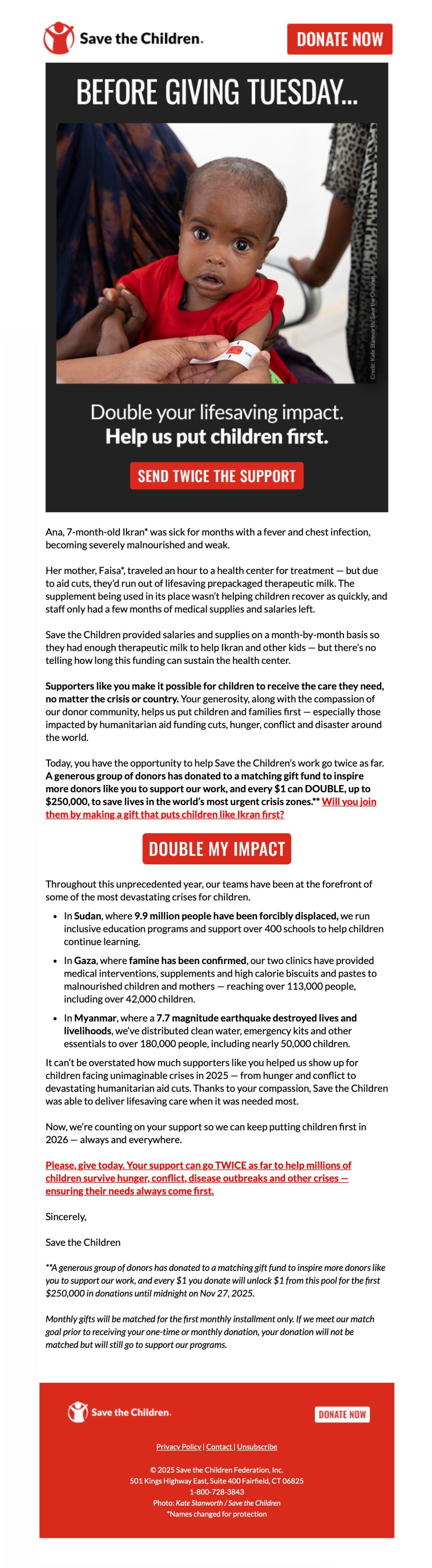 HomeAPPEALSave the Children: [Match] Millions of children are at riskAPPEAL Save the Children: [Match] Millions of children are at risk 2 weeks ago Tags:children Shares: Previous PostUN Crisis Relief: Help families in Gaza survive the winterNext PostUNHCR: Progress Update Related Posts ENGAGEMENT ActionAid: COP30: Progress on a just transition, but wealthy nations still slow things down Donorli2 days ago APPEAL CARE: 8X thankful for you ππ½ Donorli1 week ago APPEAL UNICEF USA: ONLY HOURS LEFT. Donβt miss out. Every second counts. Donorli2 weeks ago APPEAL UNHCR: Progress Update Donorli2 weeks ago