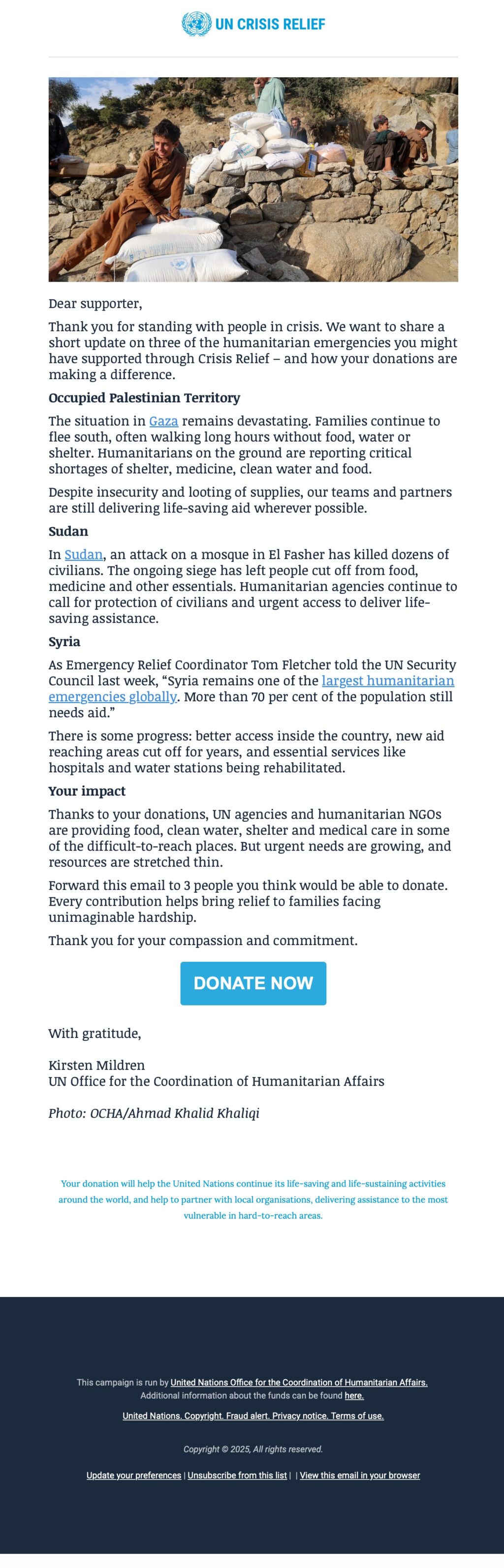 HomeAPPEALUN Crisis Relief: An update from the frontlines: Gaza, Sudan and SyriaAPPEALCULTIVATION UN Crisis Relief: An update from the frontlines: Gaza, Sudan and Syria 3 days ago Tags:disaster relief Shares: Previous PostUNHCR: Afghan earthquake survivors are receiving help Related Posts APPEAL UN Crisis Relief: An update from the frontlines: Gaza, Sudan and Syria Donorli3 days ago CULTIVATION UNHCR: Afghan earthquake survivors are receiving help Donorli1 week ago APPEAL Americares: URGENT: Gaza City is being evacuated – your support is critical Donorli2 weeks ago ENGAGEMENT Save the Children: 🪄 The power of books Donorli3 weeks ago