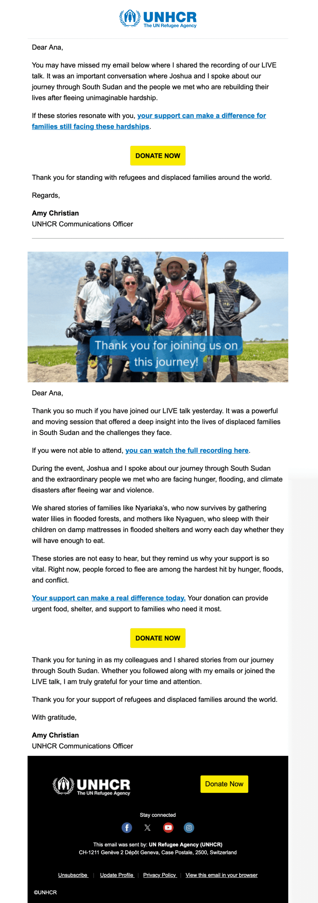 HomeAPPEALUNHCR: In case you missed it: Discover our Journey in South SudanAPPEALCULTIVATION UNHCR: In case you missed it: Discover our Journey in South Sudan 2 months ago Shares: Previous PostCARE Emergency Alert: Ana, it’s life or death in Gaza for everyoneNext PostUNICEF USA: Your July Newswire is here Related Posts CULTIVATION UNHCR: Afghan earthquake survivors are receiving help Donorli2 days ago APPEAL Americares: URGENT: Gaza City is being evacuated – your support is critical Donorli1 week ago ENGAGEMENT Save the Children: 🪄 The power of books Donorli2 weeks ago CULTIVATION charity: water: We track every donation. Now you can too Donorli3 weeks ago