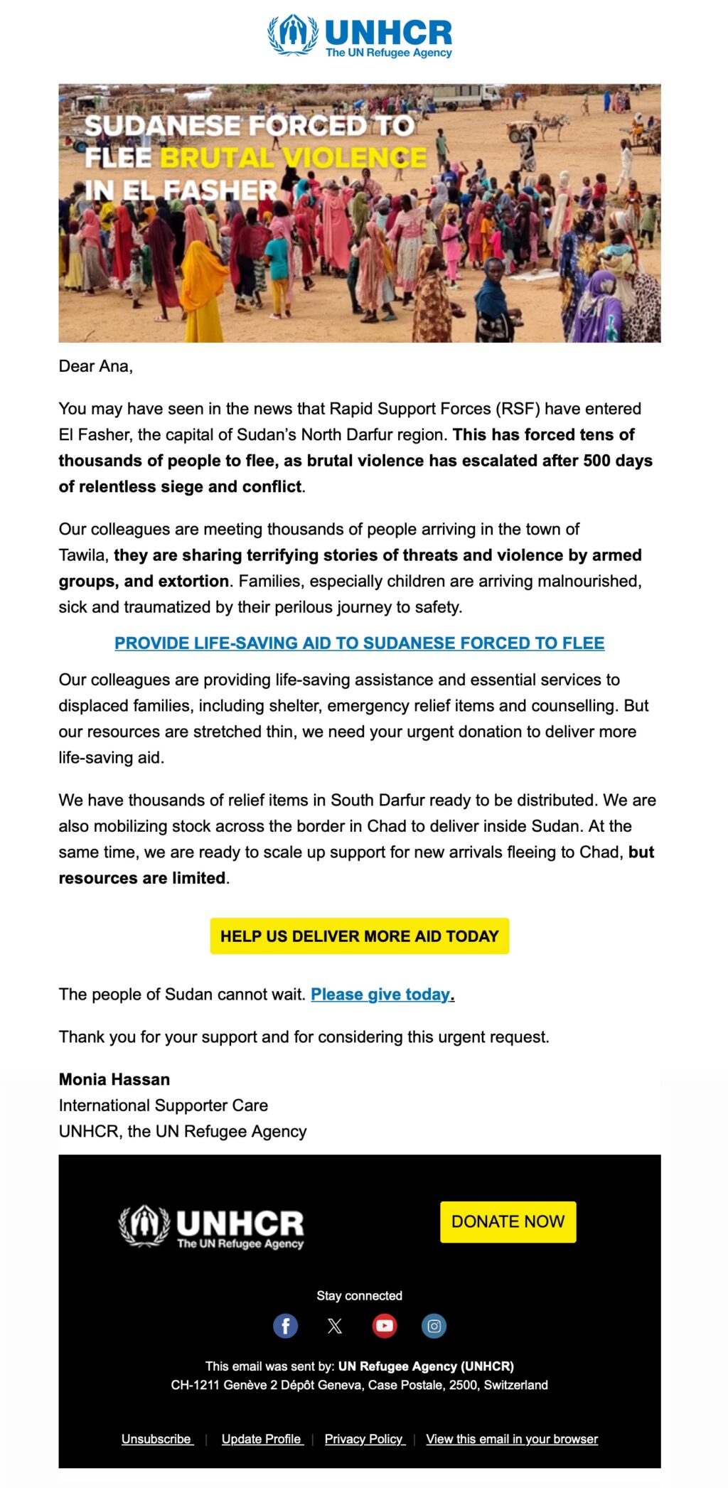 HomeAPPEALUNHCR: URGENT: Brutal violence in El Fasher forcing thousands to fleeAPPEAL UNHCR: URGENT: Brutal violence in El Fasher forcing thousands to flee 2 months ago Tags:refugees Shares: Previous PostIRC: I want to make sure you receive the latest crisis briefing out of Gaza →Next PostMAP International: EMERGENCY APPEAL: Your help needed for Hurricane Melissa survivors Related Posts NEWSLETTER Oxfam: Explore Oxfam: December Donorli2 weeks ago NEWSLETTER American Red Cross: ❄Your December Updates From the American Red Cross Donorli3 weeks ago ENGAGEMENT ActionAid: COP30: Progress on a just transition, but wealthy nations still slow things down Donorli1 month ago APPEAL CARE: 8X thankful for you 🙏🏽 Donorli1 month ago