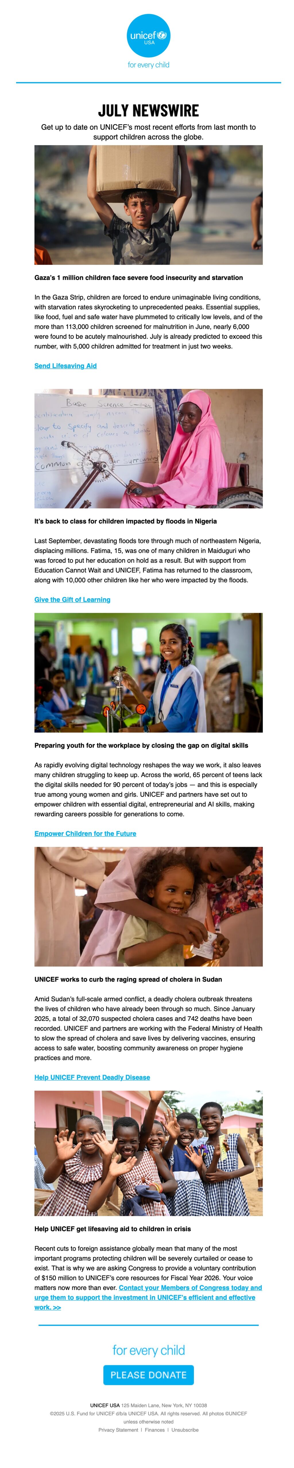HomeNEWSLETTERUNICEF USA: Your July Newswire is hereNEWSLETTER UNICEF USA: Your July Newswire is here 4 months ago Tags:children Shares: Previous PostUNHCR: In case you missed it: Discover our Journey in South SudanNext PostAmericares: The situation in Gaza is dire. Here’s how you’re making an impact. Related Posts APPEAL MAP International: EMERGENCY APPEAL: Your help needed for Hurricane Melissa survivors Donorli7 days ago APPEAL UNHCR: URGENT: Brutal violence in El Fasher forcing thousands to flee Donorli2 weeks ago APPEAL IRC: I want to make sure you receive the latest crisis briefing out of Gaza → Donorli3 weeks ago APPEAL Save the Children: 🌍 Open “a new world” for children in conflict Donorli4 weeks ago